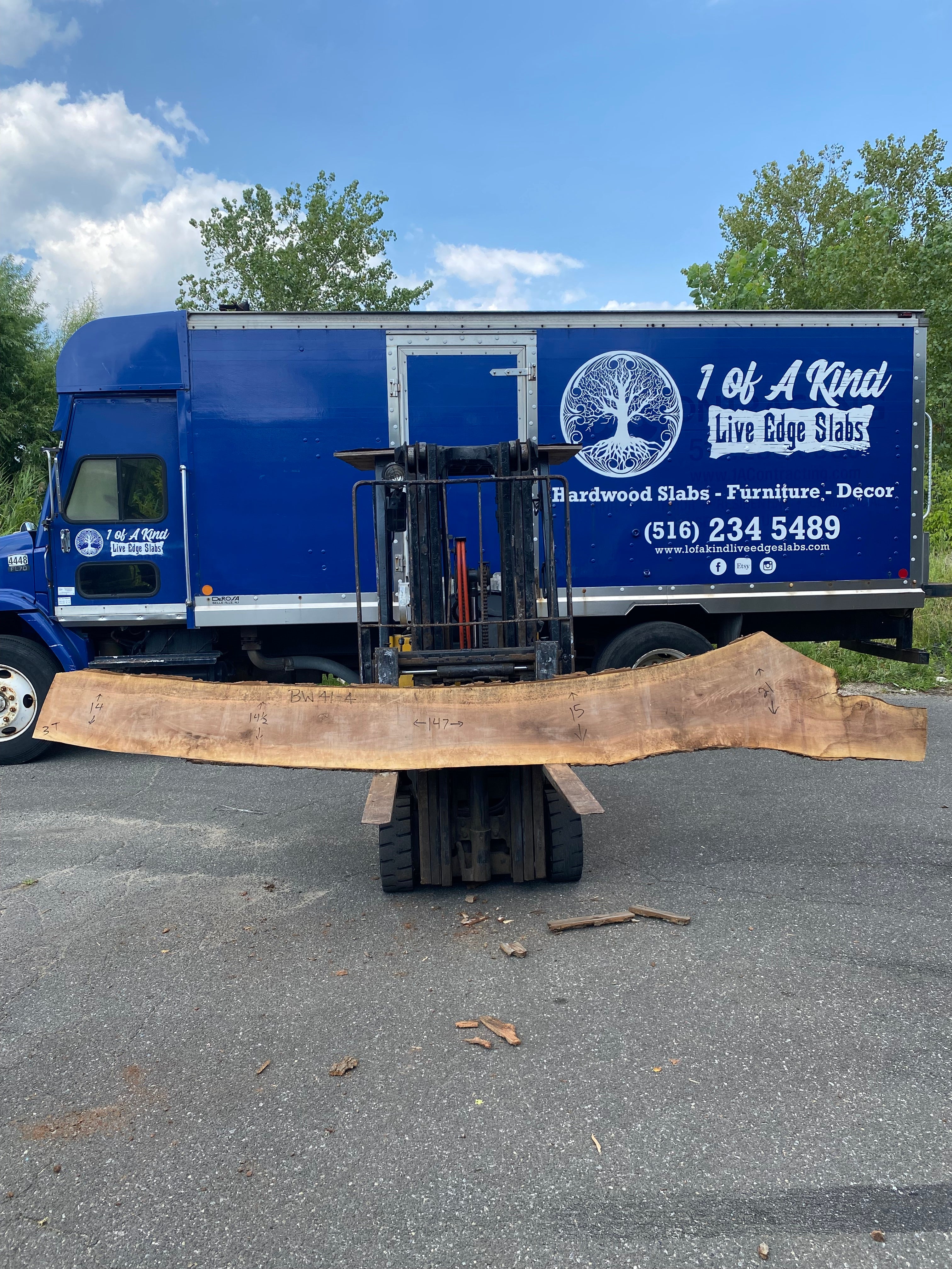 This stunning live edge black walnut slab measures 147"L x widths ranging from 14-21" x3"T, making it the perfect centerpiece for your next woodworking project. Its natural, undulating edges offer a unique and elegant touch. Let the natural beauty of this slab bring your vision to life.