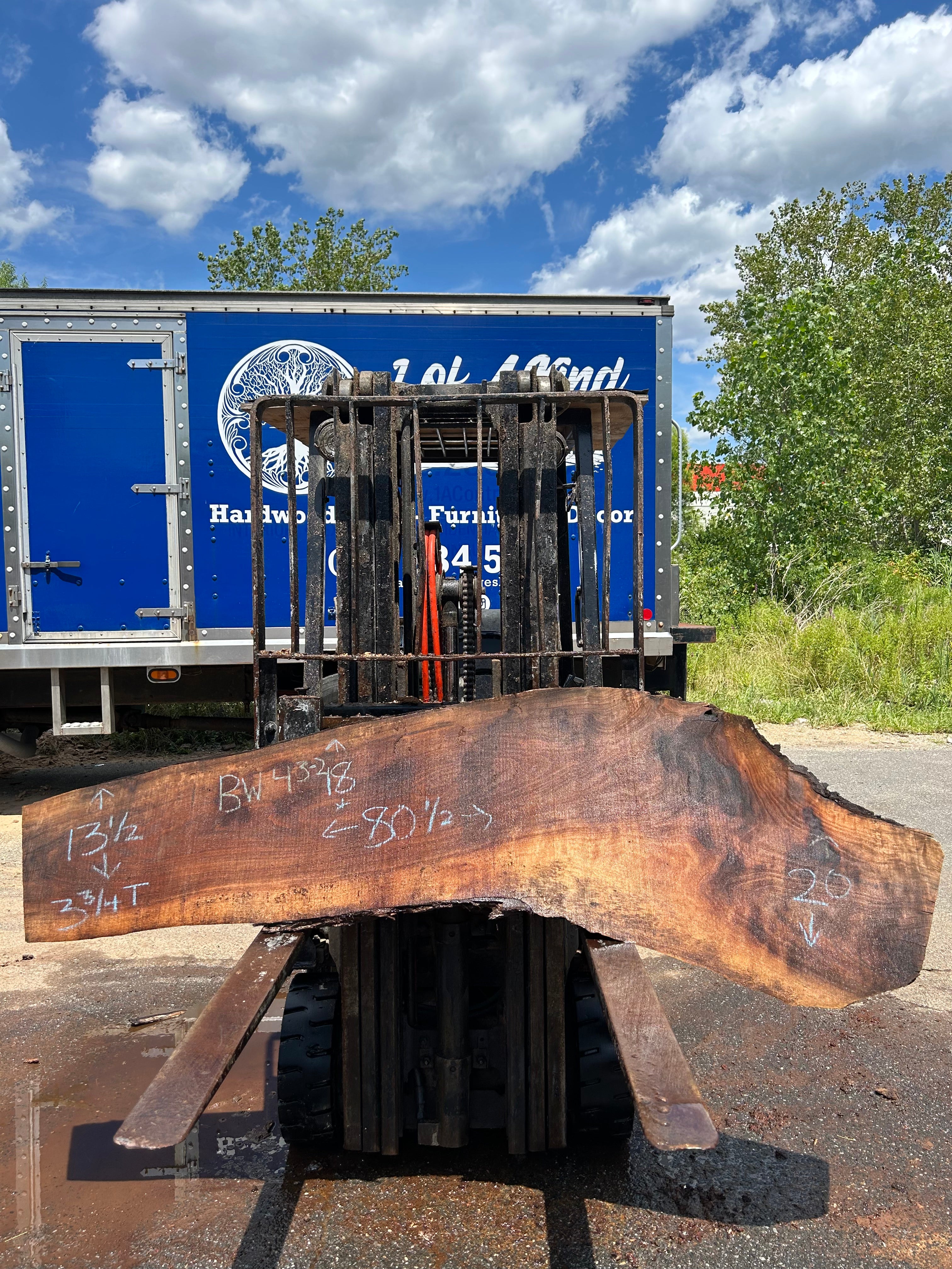 Discover the beauty of woodworking with this gorgeous live edge black walnut slab. Measuring 80 1/2"L x 13 1/2-20"W x 3 3/4"T, it's perfect for creating custom furniture or decor that will last for generations! Bring a warm, rustic feel into your home and let your creativity flow.