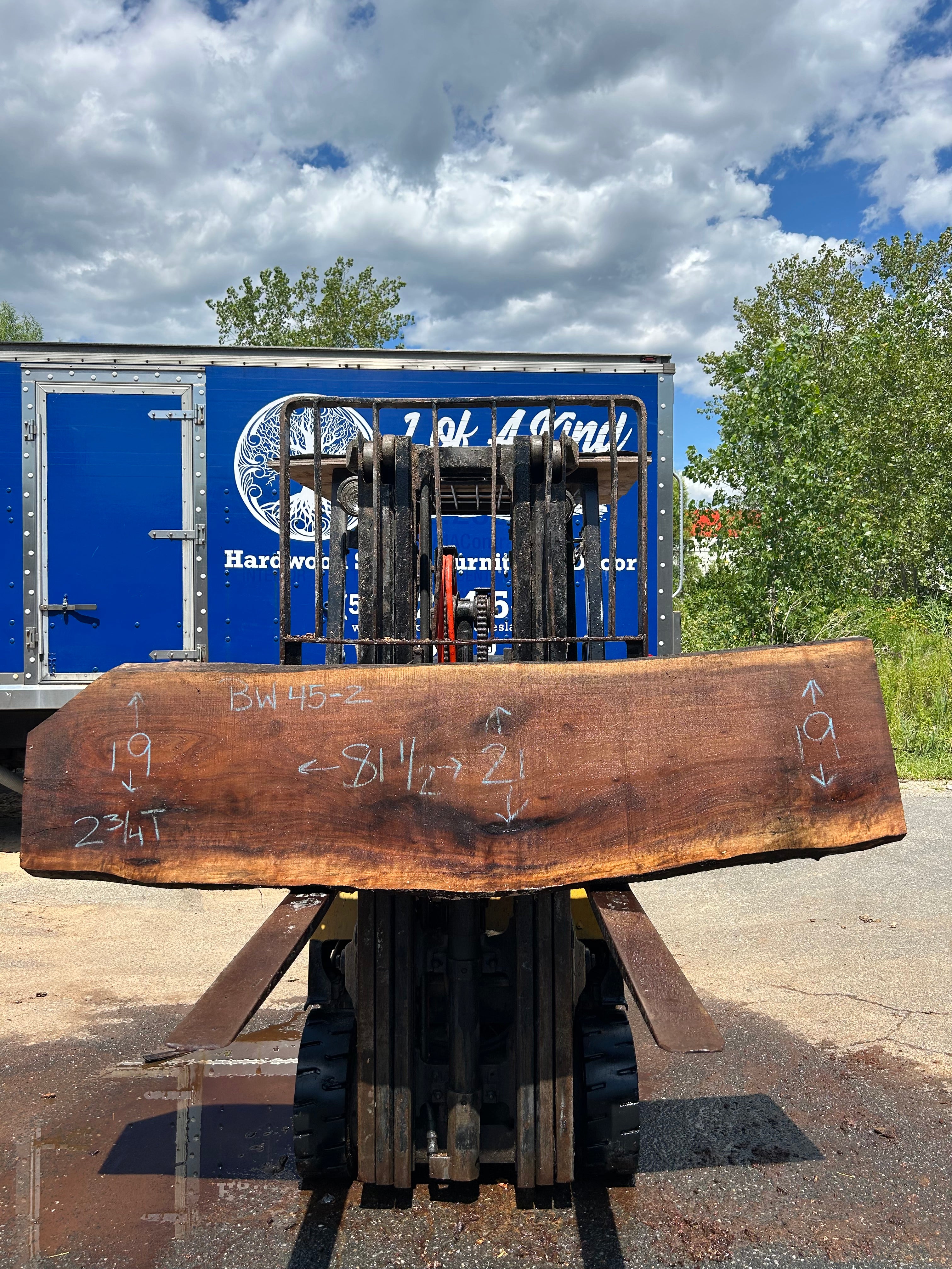This stunning live edge black walnut slab measures 81 1/2"L with widths ranging from 19-21" x2 3/4"T, making it the perfect centerpiece for your next woodworking project. Its natural, undulating edges offer a unique and elegant touch. Let the natural beauty of this slab bring your vision to life.