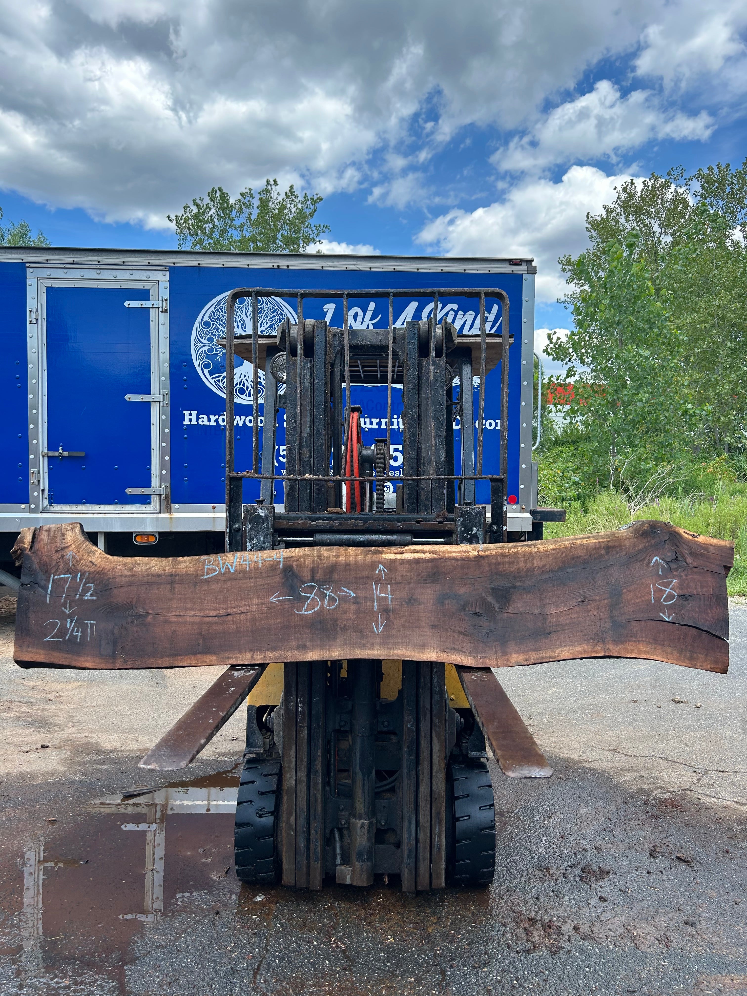Discover the beauty of woodworking with this gorgeous live edge black walnut slab. Measuring 88"L x 14-18"W x 2 1/4"T, it's perfect for creating custom furniture or decor that will last for generations! Bring a warm, rustic feel into your home and let your creativity flow.