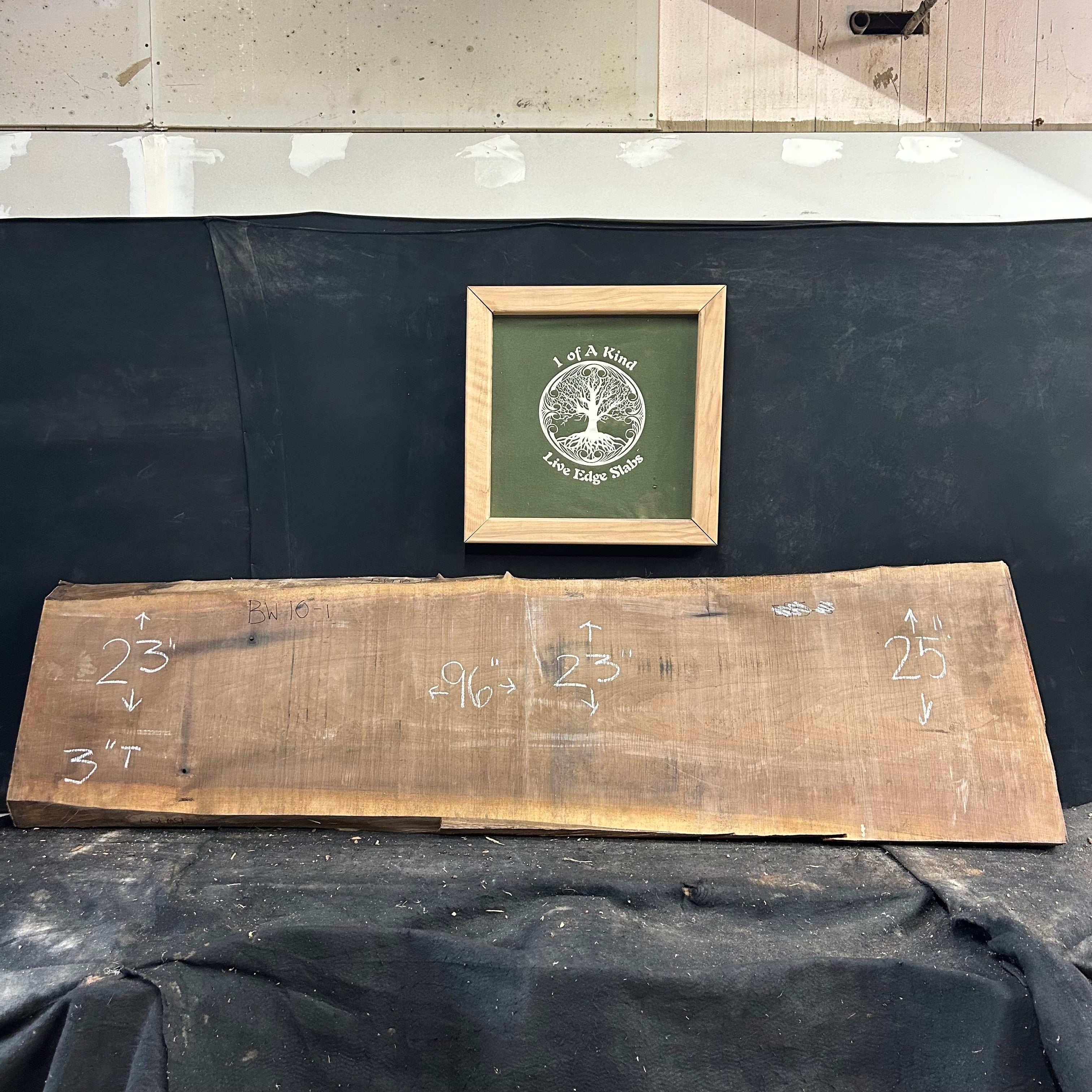 This live edge black walnut slab measures 96"Lx23-25"Wx3"T, providing a large and unique piece of wood. Its live edge captures the natural beauty of the wood, making it perfect for a variety of woodworking projects.