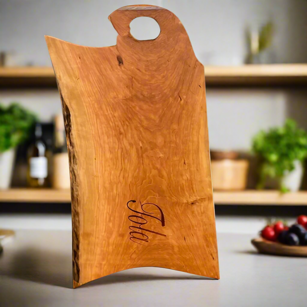 Showcase your favorite cheeses, crackers, and charcuterie with our Live Edge Cherry Charcuterie Board. Handcrafted from a single piece of Cherry wood by skilled artisans, it brings a unique natural elegance to any table. Its rich color and organic edges make it a stunning centerpiece that enhances every gathering.