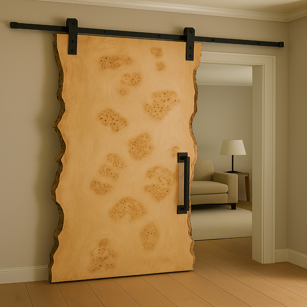 Elevate your home’s entrance with the Live Edge Mapa Burl Door, showcasing the natural beauty and strength of genuine Mapa Burl wood. Each door features distinctive grain patterns that create a captivating centerpiece, adding warmth and elegance to any space. Crafted for durability and style, this door transforms your room with an inviting and sophisticated touch.