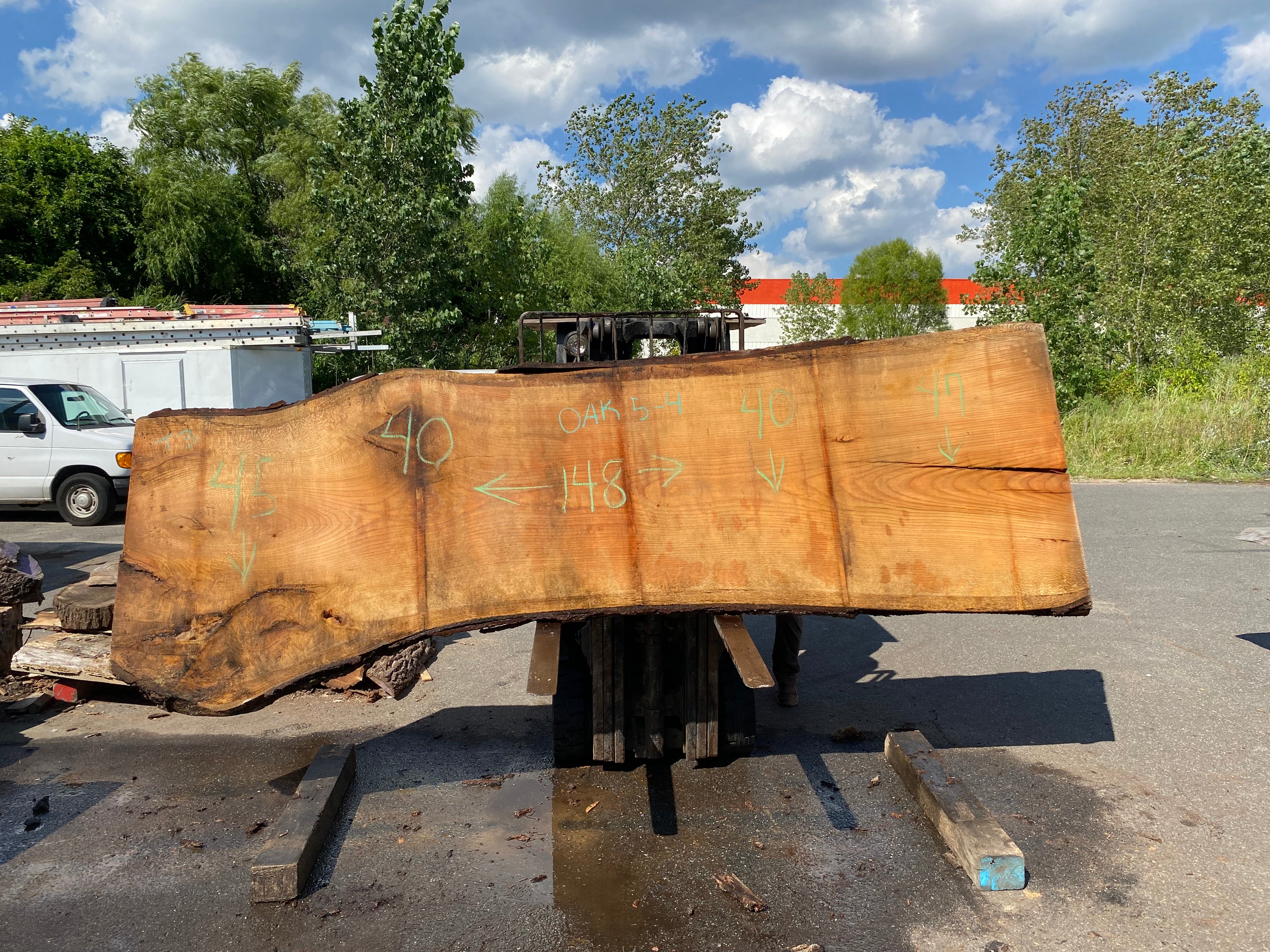 This stunning live edge oak slab will add beauty and style to your home. The 148” length, 3” thickness, and 40-47” wide slab showcases the natural shape of the wood. Perfect for creating a one-of-a-kind piece, this slab is sure to garner admiration!