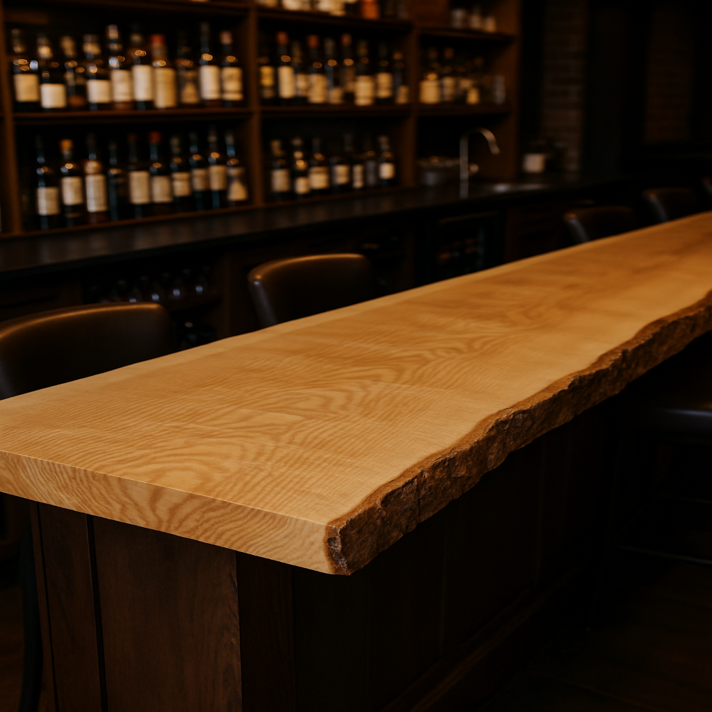 Transform your bar area with the Live Edge Sycamore Bar Top, designed to create a warm and inviting atmosphere. Its natural, rustic charm is accentuated by a distinctive live edge, making each piece truly one-of-a-kind and adding unique character to your space. Crafted from resilient sycamore wood, this bar top promises durability and long-lasting beauty, maintaining its rich luster through years of use. Customize the finish to suit your style with options including satin, semi-gloss, and gloss, each enhancing the wood’s natural grain in different ways. Perfect for entertaining or casual relaxation, this bar top combines functionality with timeless elegance, making your bar space both stylish and welcoming.